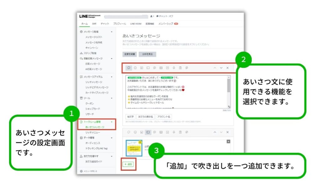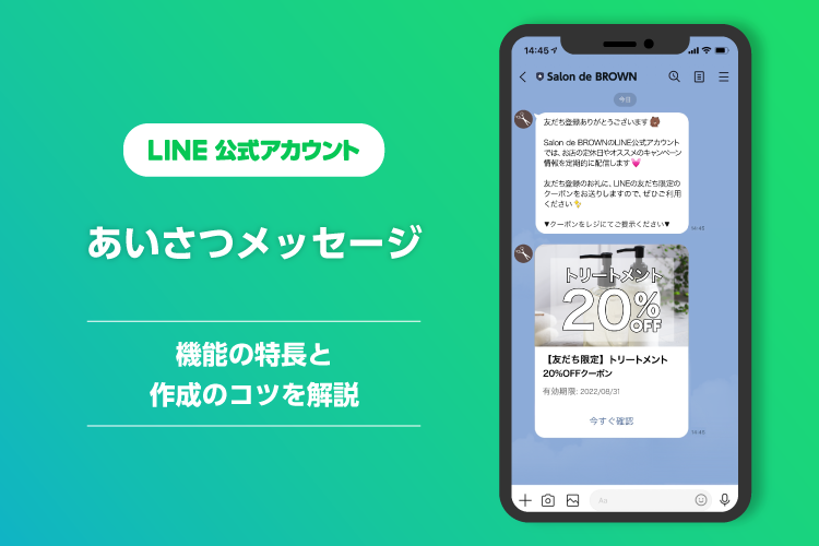 あいさつメッセージは、「LINE公式アカウント」にお友達追加してくれた方、またアカウントブロックを解除した方へ、自動的に配信されるあいさつ文です。