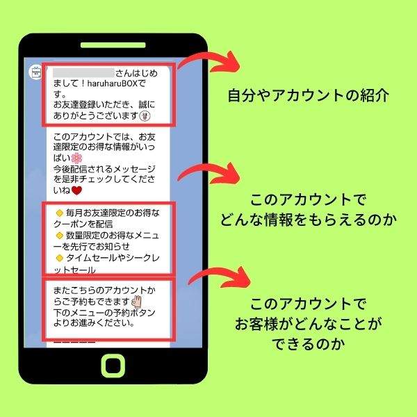 その名の通り、お客様への最初の「あいさつ文」なので、しっかり自分の「LINE公式アカウント」を紹介する必要があります。リアルな出会いでも、第一印象は大事ですからね!