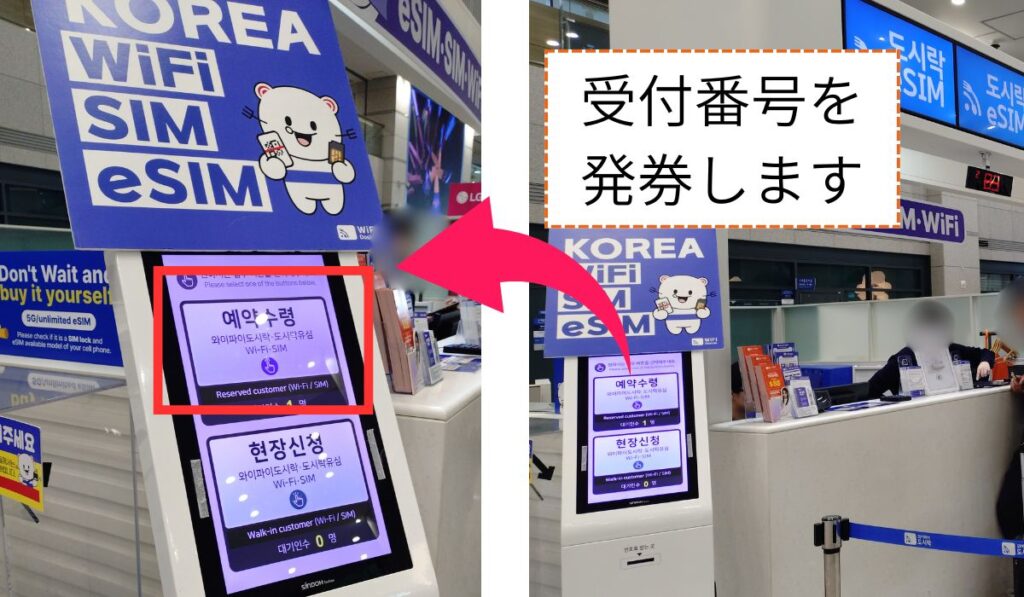 受付番号の発券機があったので、「예약수령(予約受領)」のボタンを押すと、発券された紙が出てきました。番号が書いてあるので、番号が呼ばれるまで待ちます。