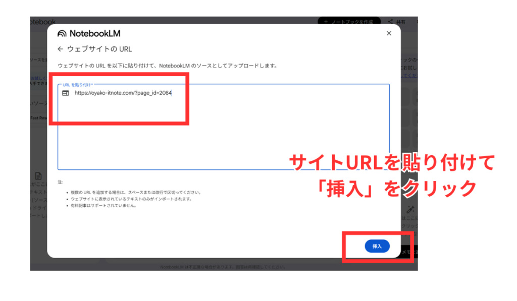 サイトURLを貼り付けて、「挿入」をクリックします。