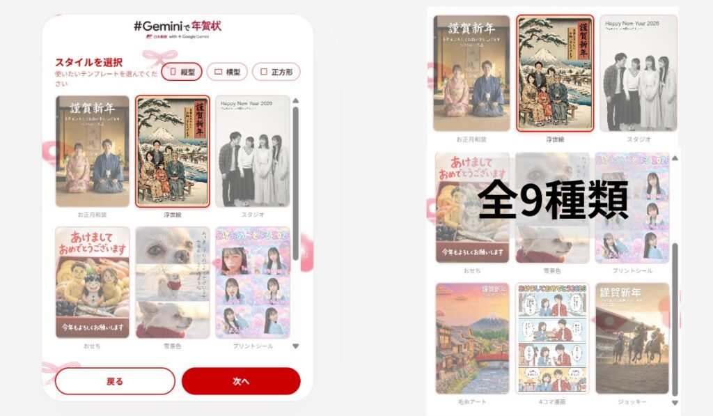 【#Geminiで年賀状】で作成できる画像のスタイルは9種類で、少しユーモアのあるおもしろいものが多めでした。