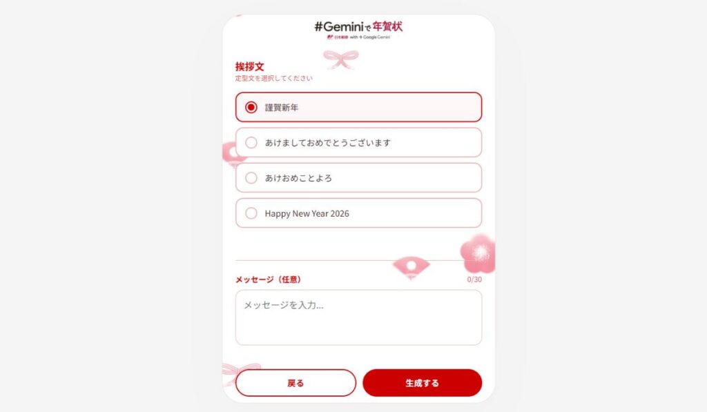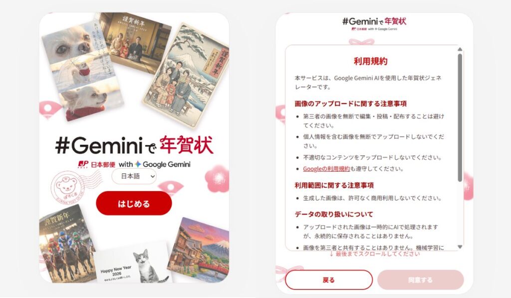 年賀状が間に合わずどうしようと思っていた時、「#Geminiで年賀状」という郵便局のサイトを見つけました。Geminiで作成した年賀状を、そのまま郵便局の印刷サービスで印刷できるとのこと。