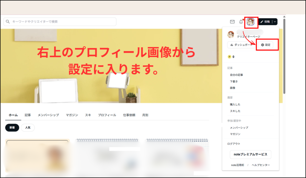 まず右上のプロフィールボタンから、「設定」に入ります。