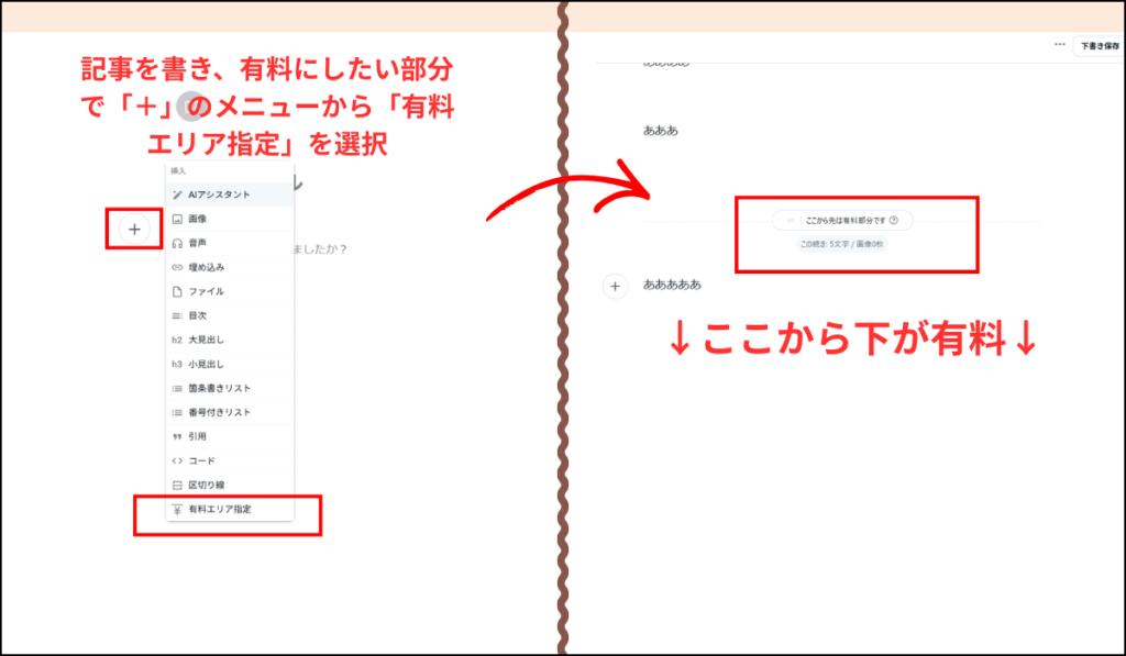 まず記事を書き、有料にしたい部分で「+」のメニューから、「有料エリア指定」を選択します。