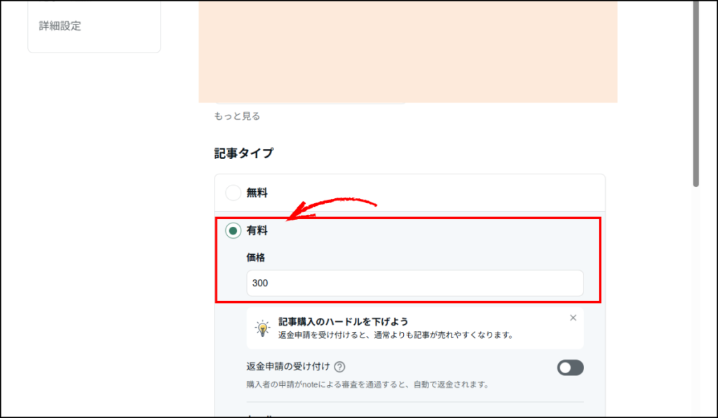 記事を書き終わり、後悔する直前の画面で、記事の価格を設定することができます。