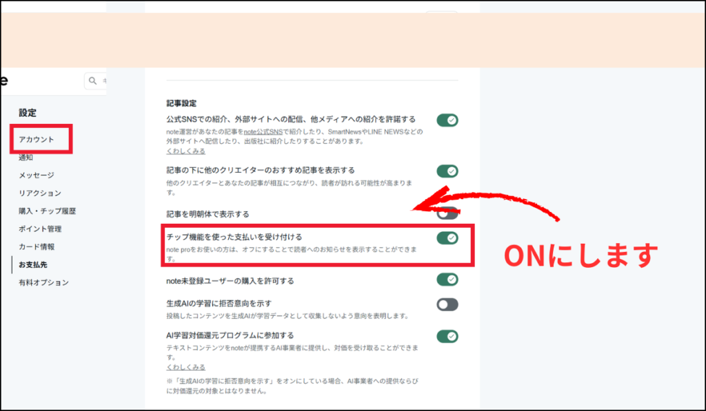 左メニューのアカウントを選択し、「チップ機能を使った支払いを受け付ける」をオンにしましょう。